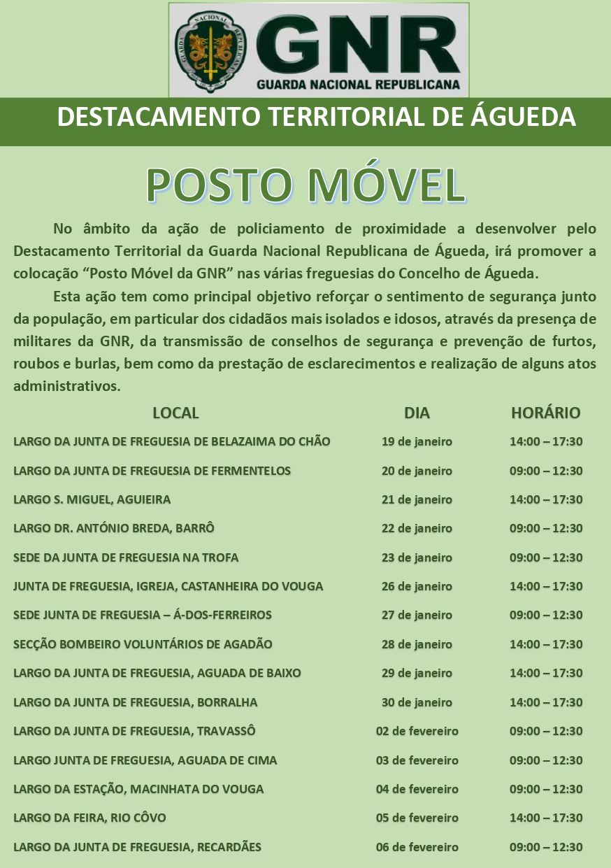 A Junta de Freguesia de Valongo do Vouga divulga a atividade do Posto Móvel da GNR, a realizar nos dias e horários.