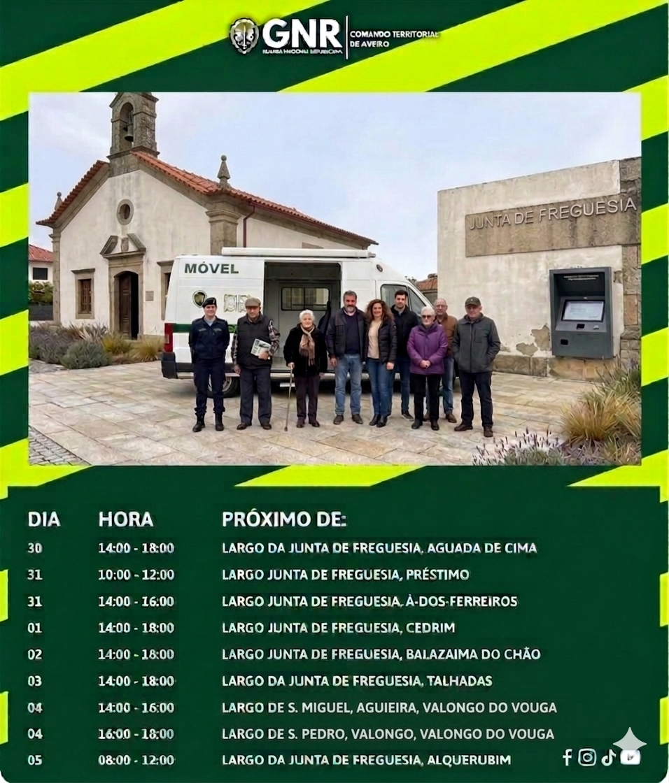 A Guarda Nacional Republicana, através do Comando Territorial de Aveiro / Destacamento Territorial de Águeda, vai promover, entre os dias 30 de março e 5 de abril, várias ações de sensibilização com o Posto Móvel, dirigidas à população, no âmbito da prevenção dos incêndios rurais, da proteção de pessoas e bens e da preservação do património florestal.